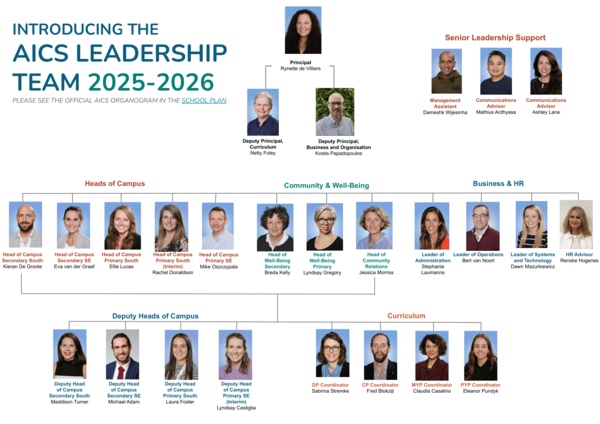 The School Leadership Team of the AICS consists of the Senior Leadership Team, the Primary Leadership Team, the Secondary Leadership Team, the Heads of Wellbeing, Head of Community and two Team leaders.